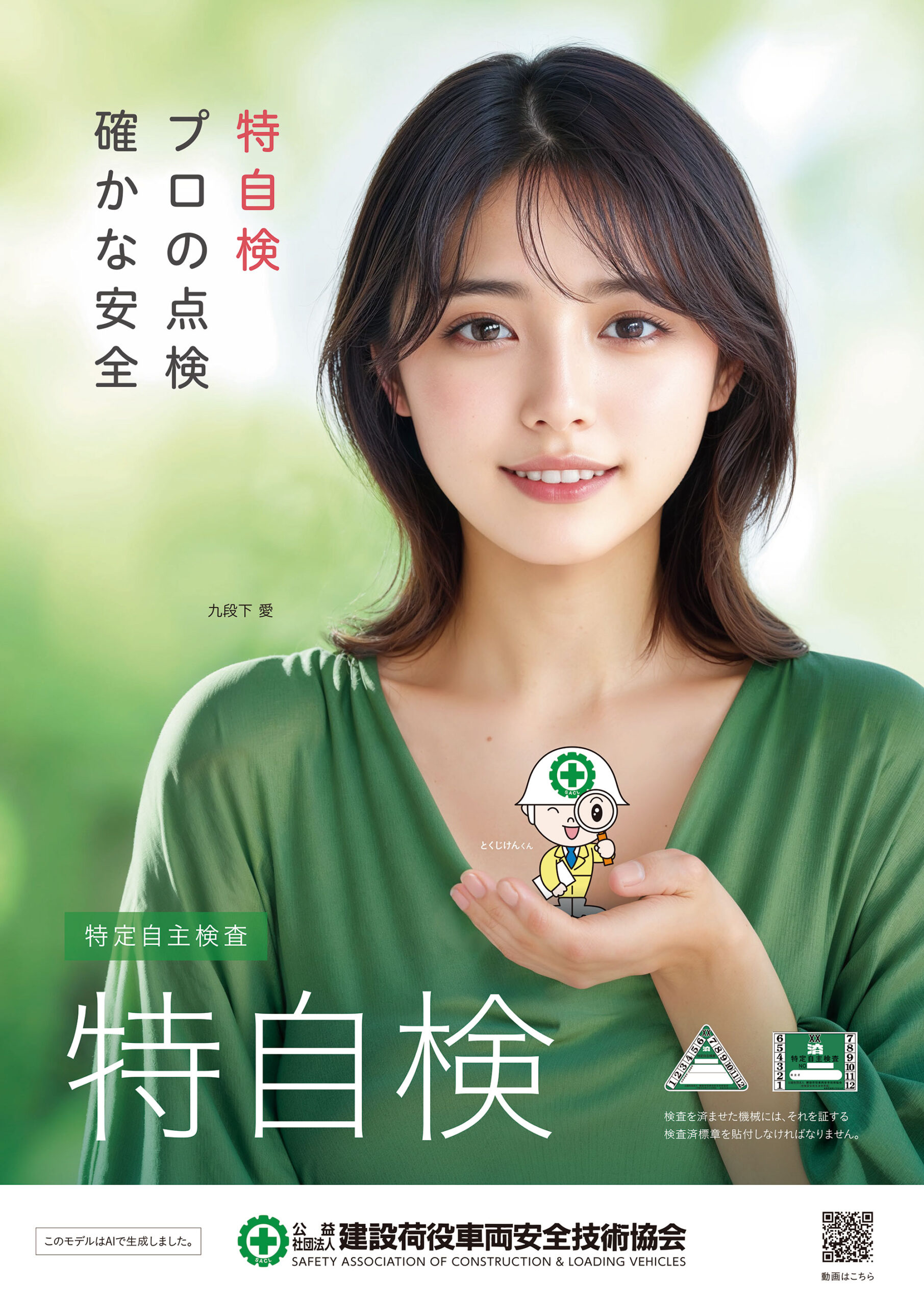 令和8年特自検啓発イメージモデルに「九段下愛」(AIモデル)を起用しました。 令和8年特自検年間標語は「特自検 プロの点検 確かな安全」です。