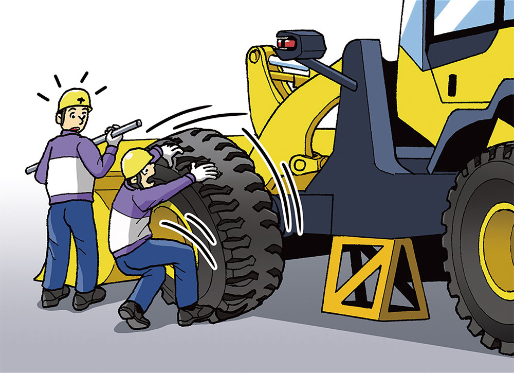 ● タイヤの飛び出しに備え、正面には立たず、斜め横または後方で作業を行う。