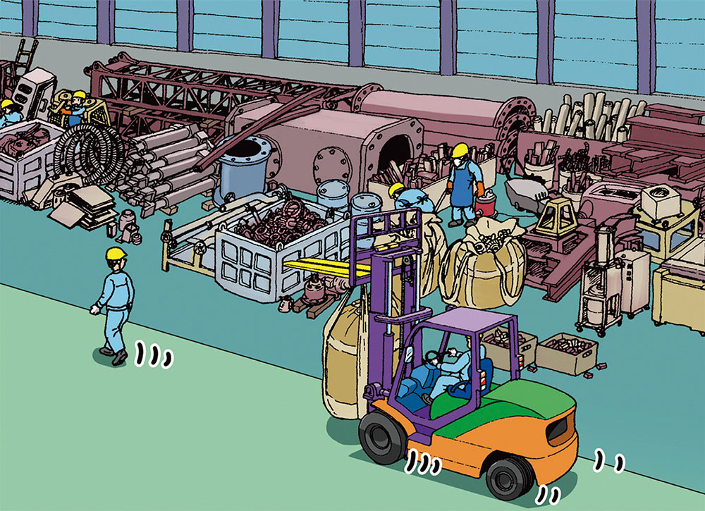 ● 誘導員の配置や警報装置の活用により、フォークリフトの接近を作業員・運転者双方に確実に知らせる。